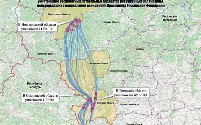 Το ρωσικό Υπουργείο Αμυνας δημοσίευσε βίντεο που δείχνει έναν στρατιώτη με κρυμμένο το πρόσωπο δίπλα σε συντρίμμια ενός drone και έναν χάρτη που υποτίθεται ότι δείχνει την πορεία των drones κατά την διάρκεια της επίθεσης για την οποία η Μόσχα κατηγορεί το Κίεβο.