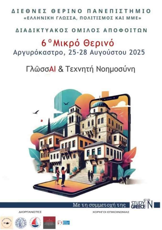 Ο Διαδικτυακός Όμιλος Αποφοίτων του Διεθνούς Θερινού Πανεπιστημίου «Ελληνική γλώσσα, Πολιτισμός και Μ.Μ.Ε» σε συνεργασία με το Πανεπιστήμιο Eqrem Cabej και το Τμήμα Ελληνικής Γλώσσας, Λογοτεχνίας και Ελληνικού Πολιτισμού οργανώνει το «6ο Μικρό Θερινό», στο Αργυρόκαστρο, 25-28 Αυγούστου 2025.