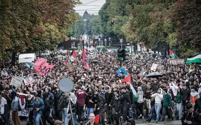 Στην Μπολόνια, στην πορεία των εργαζομένων παίρνουν επίσης μέρος φοιτητές και μαθητές, με πανό τα οποία γράφουν "θα μπλοκάρουμε τα πάντα, ελεύθερη Παλαιστίνη".