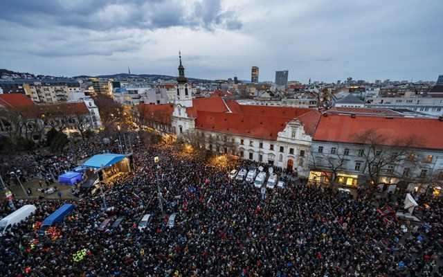 Οι οργανωτές υπολογίζουν ότι 60.000 άνθρωποι μετείχαν στη διαδήλωση στην Πλατεία Ελευθερίας, σχεδόν τετραπλάσιοι σε σύγκριση με τη συγκέντρωση διαμαρτυρίας που έγινε πριν από δύο εβδομάδες. Οι συγκεντρωμένοι φώναζαν "Φτάνει πια με τον Φίτσο" και "Είμαστε Ευρώπη". Κάποια στιγμή φώτισαν την πλατεία με τα κινητά τηλέφωνά τους, όταν σημειώθηκε ολιγόλεπτη διακοπή ρεύματος.