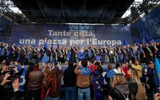 Πολλοί έφτασαν στην Πιάτσα ντελ Πόπολο με σημαίες της Ευρώπης. Αρκετοί άλλοι με εκείνες της ειρήνης, αλλά και της Ουκρανίας. Τόσο στο εσωτερικό της ιταλικής συμπολίτευσης, άλλωστε, όσο και της αντιπολίτευσης, δεν υπάρχουν ενιαίες θέσεις σε ό,τι αφορά το ουκρανικό και το σχέδιο εξοπλισμού της Ευρωπαϊκής Ένωσης.