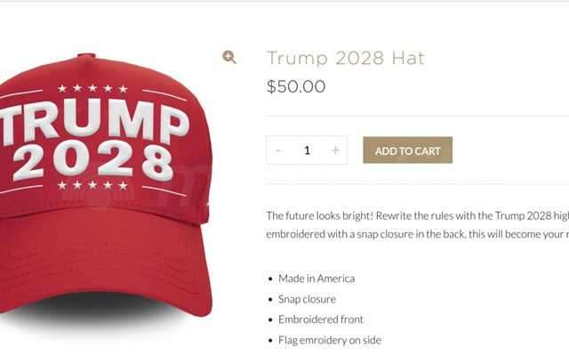 Το ηλεκτρονικό κατάστημα του Ντόναλντ Τραμπ διαθέτει στο εξής κόκκινα καπελάκια που φέρουν την επιγραφή "Trump 2028", το έτος των επόμενων προεδρικών εκλογών στις ΗΠΑ, στις οποίες ο Ρεπουμπλικάνος δισεκατομμυριούχος, σύμφωνα με το Σύνταγμα, δεν μπορεί να συμμετάσχει.